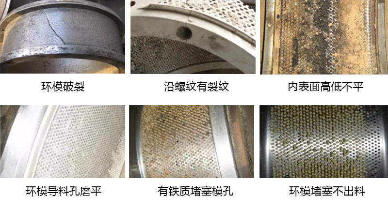 3、環(huán)模工作一段時間后,出料各小孔內(nèi)壁磨損,孔徑增大,所生產(chǎn)的顆粒直徑超過規(guī)定值而失效。